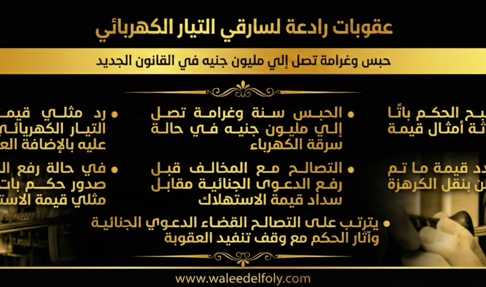 في إطار الحرص على التوعية القانونية بالمستجدات التشريعية، نود الإشارة إلى تغليظ العقوبات في القانون الجديد لمواجهة ظاهرة سرقة التيار الكهربائي، والتي تصل إلى الحبس والغرامات المالية الضخمة. وفيما يلي ملخص لأهم العقوبات والإجراءات الواردة في القانون الجديد كما هو موضح في التصميم المرفق: ⚖️ العقوبات الأساسية: 🔸 الحبس والغرامة: يعاقب المخالف بالحبس لمدة سنة […]